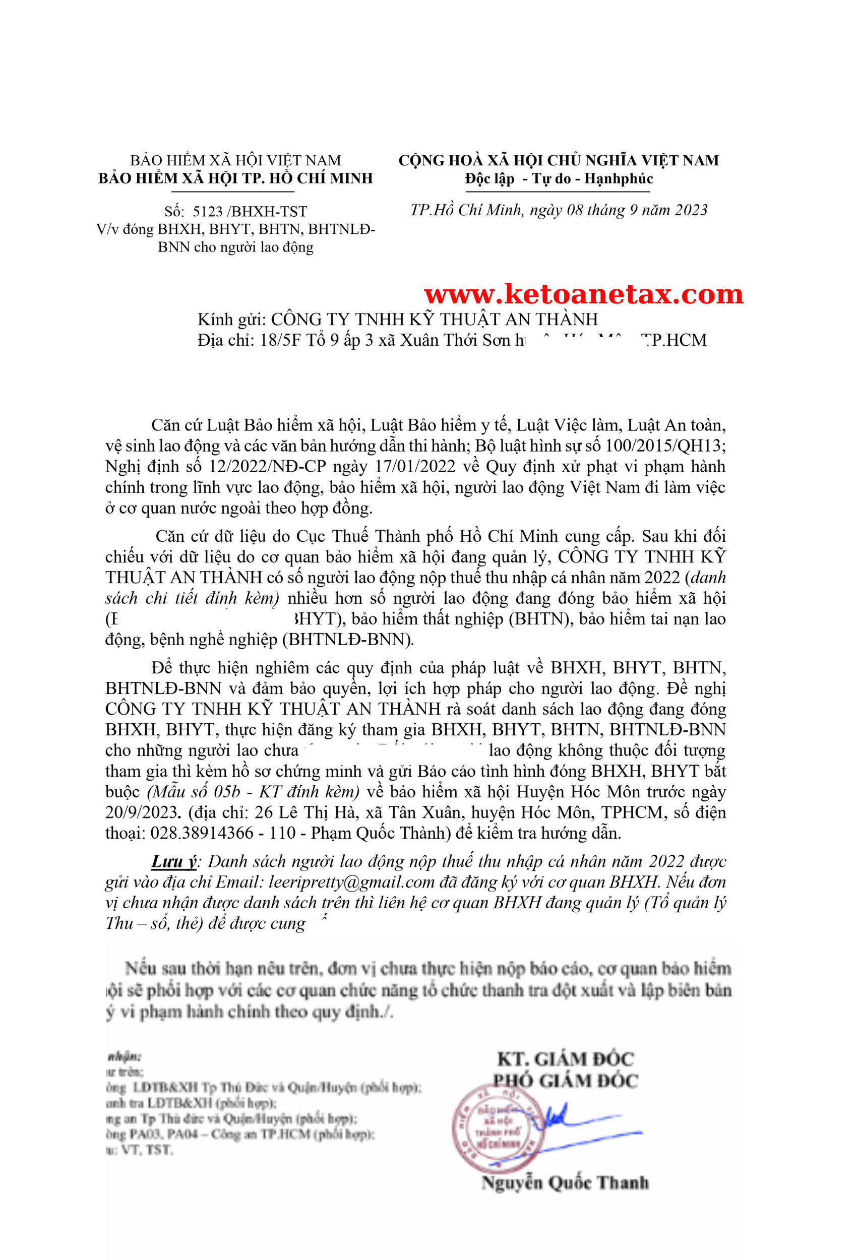 Để thực hiện nghiêm các quy định của pháp luật về BHXH, BHYT, BHTN, BHTNLĐ-BNN và đảm bảo quyền, lợi ích hợp pháp cho người lao động. Đề nghị Công Ty TNHH TMDV Nguyễn Quang Huy, rà soát danh sách lao động đang đóng BHXH, BHYT, thực hiện đăng ký tham gia BHXH, BHYT, BHTN, BHTNLĐ-BNN cho những người lao chưa tham gia. Đối với người lao động không thuộc đối tượng tham gia thì kèm hồ sơ chứng minh và gửi Báo cáo tình hình đóng BHXH, BHYT bắt buộc (Mẫu số 05b-KT đính kèm) về phòng Quản lý Thu - Sổ, thẻ trước ngày 20/09/2023.(địa chỉ 117C Nguyễn Đình Chính, phường 15, quận Phú Nhuận, TP Hồ Chí Minh, số điện thoại 028.39979039 line 1562 – ôngxxxxxxx) để kiểm tra hướng dẫn.