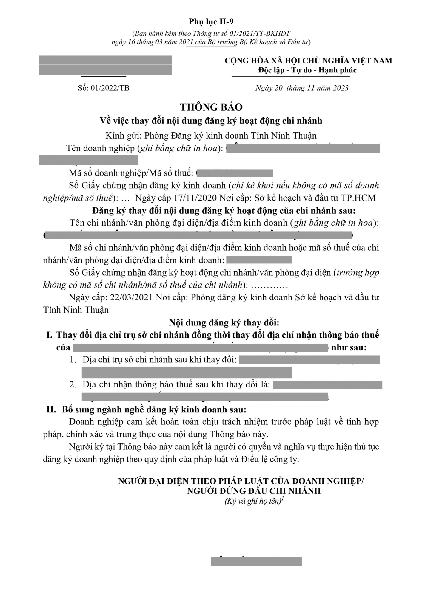 Mẫu đăng ký thay đổi địa chỉ chi nhánh doanh nghiệp phụ lục II-9.