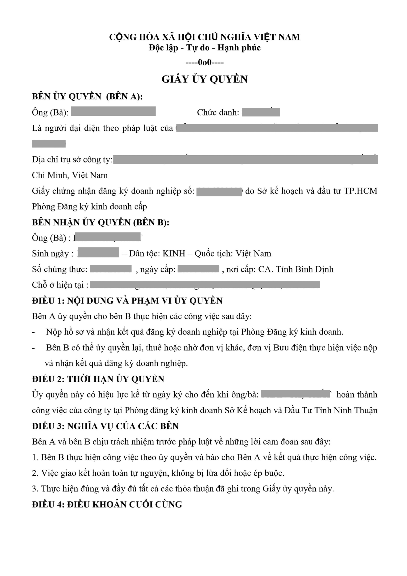 Mẫu ủy quyền đăng ký thay đổi nội dung địa chỉ chi nhánh doanh nghiệp.