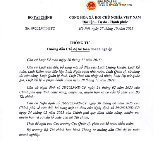 Ngày 27/10/2025, Bộ trưởng Bộ Tài chính chính thức ban hành Thông tư 99/2025/TT-BTC hướng dẫn Chế độ kế toán doanh nghiệp thay thế thông tư 200/2014/TT-BTC.
