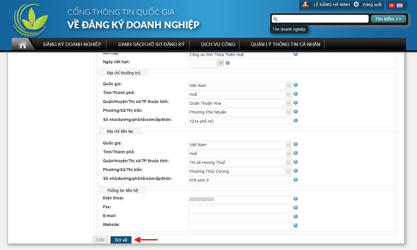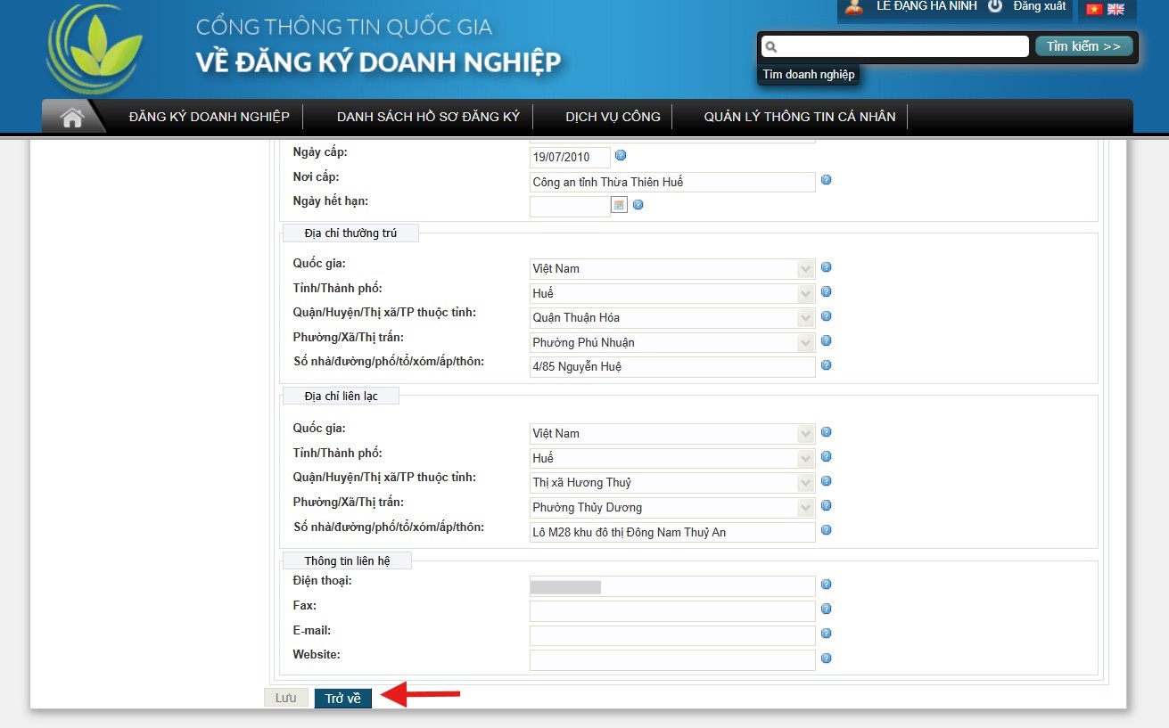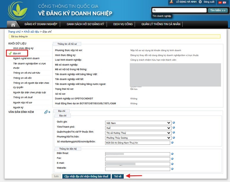 Doanh nghiệp KHÔNG thay đổi thông tin SỐ NHÀ/ĐƯỜNG PHỐ/TỔ/XÓM/ẤP/THÔN, thực hiện thao tác ấn nút TRỞ VỀ màn hình khối dữ liệu chính để tiếp tục thực hiện thay đổi nội dung các trường thông tin khác (nếu có).