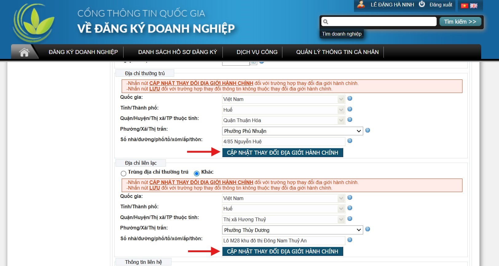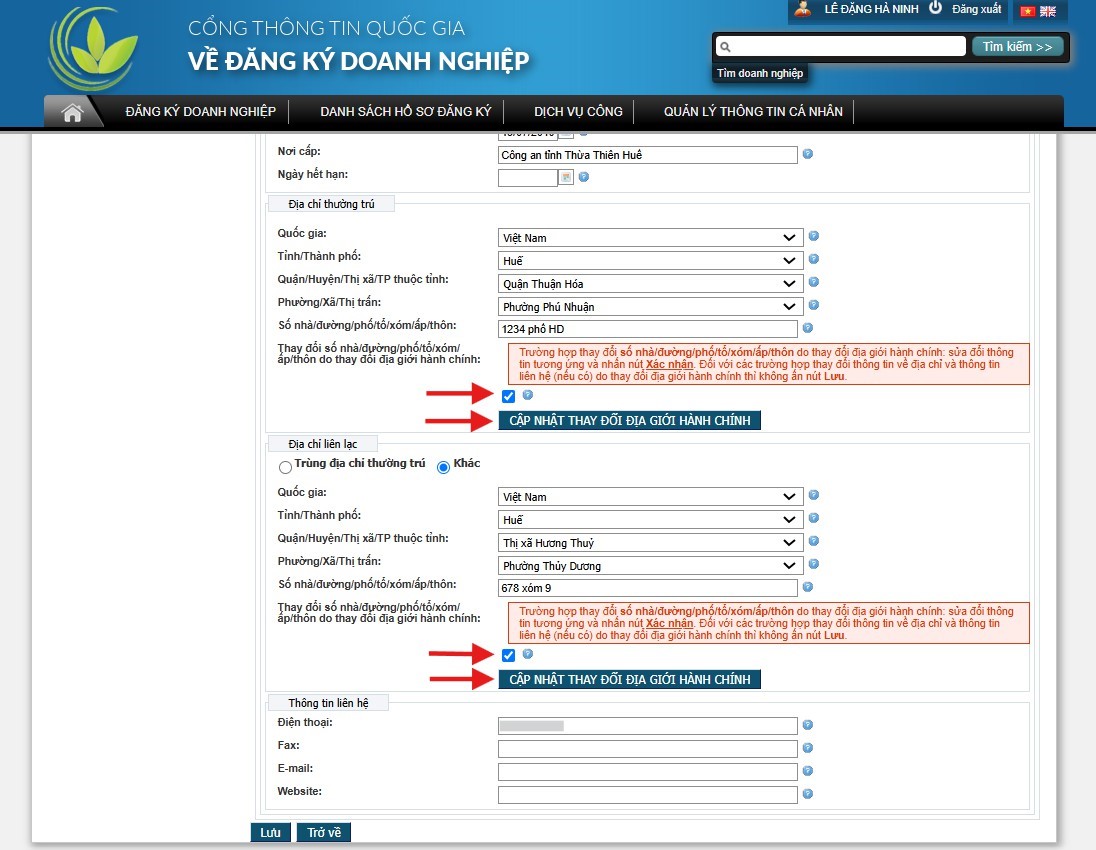 2. Đăng ký thay đổi địa chỉ thường trú/địa chỉ liên hệ của chủ sở hữu doanh nghiệp/người đại diện theo pháp luật/thành viên góp vốn: