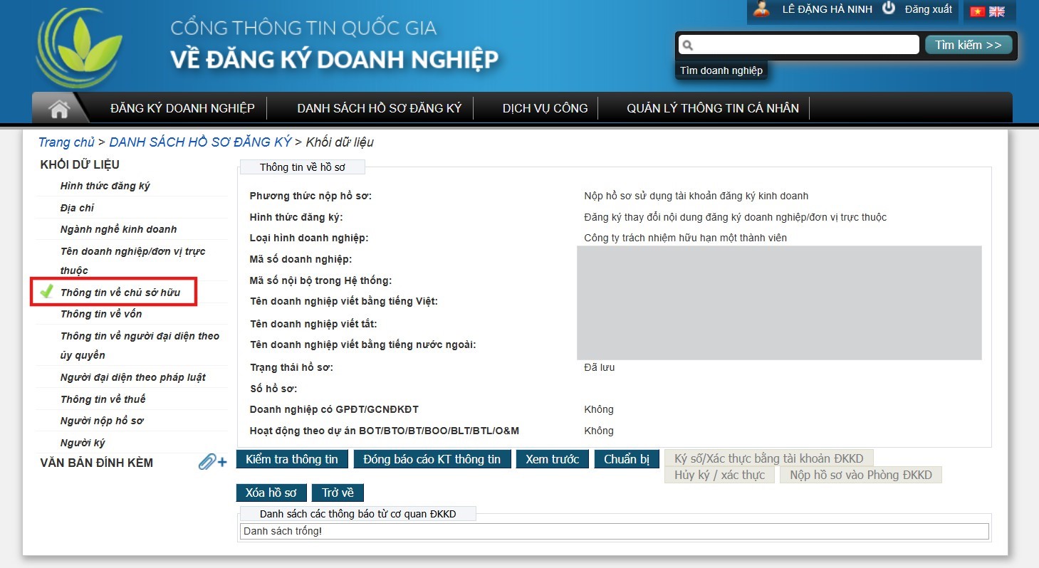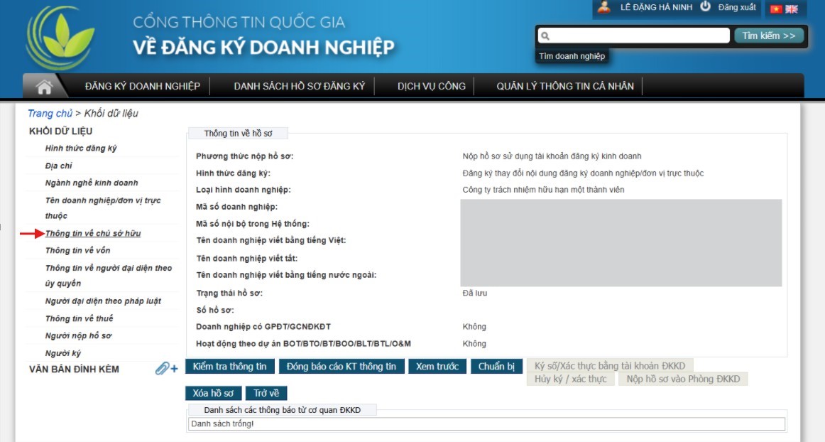 Tại màn hình KHỐI DỮ LIỆU, lựa chọn trường dữ liệu “THÔNG TIN VỀ CHỦ SỞ HỮU”