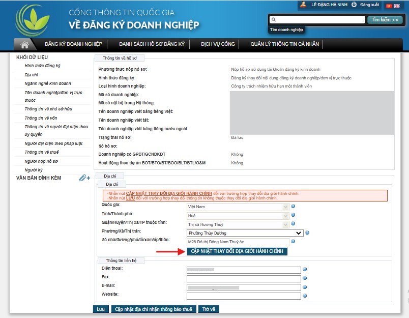 - Ấn nút CẬP NHẬT THAY ĐỔI ĐỊA GIỚI HÀNH CHÍNH.