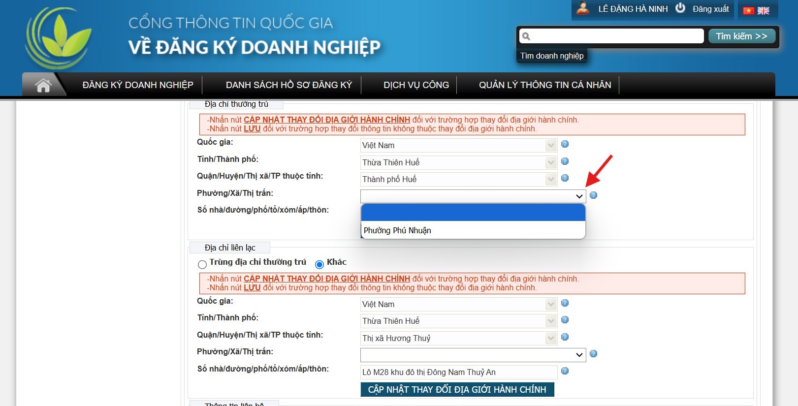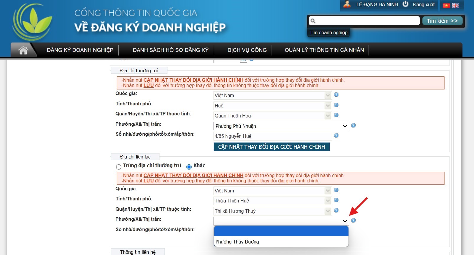 Lựa chọn thông tin Phường/Xã/Thị trấn đã được Hệ thống cập nhật theo thay đổi địa giới hành chính mới nhất.