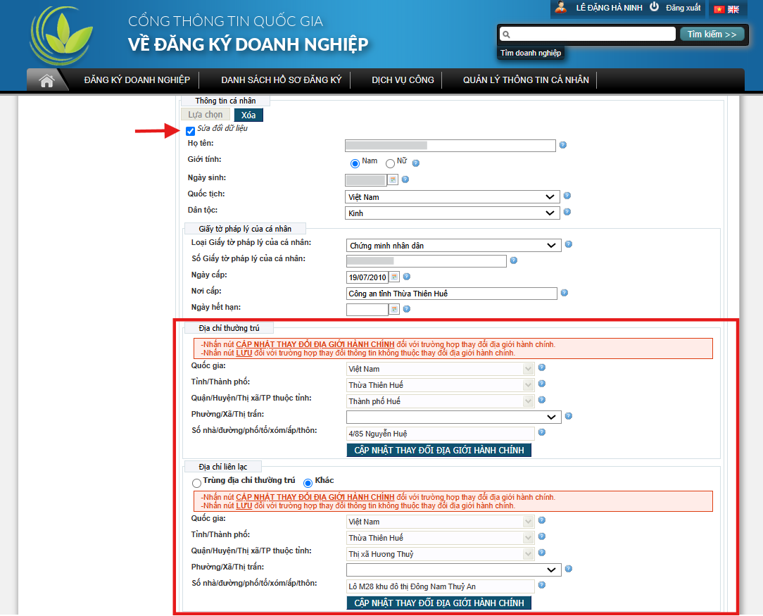 - Ấn nút tích xác nhận thông tin thay đổi địa chỉ do thay đổi địa giới hành chính;