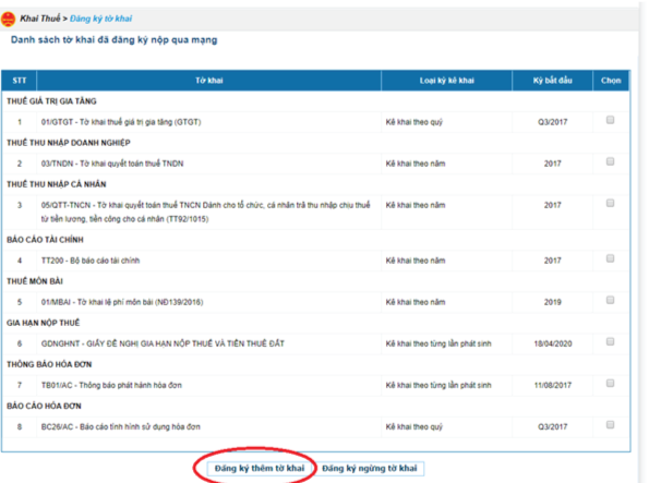 Chọn đăng ký thêm tờ khai. Tìm tới mục đăng ký gia hạn nộp thuế theo nghị định 41/2020/NĐ-CP ban hành ngày 08/04/2020 về việc gia hạn tiền nộp thuế thêm 5 tháng năm 2020 cho kỳ thuế quý 1/2020, quý 2/2020 và tiền thuế phát sinh từ quyết toán năm 2019.