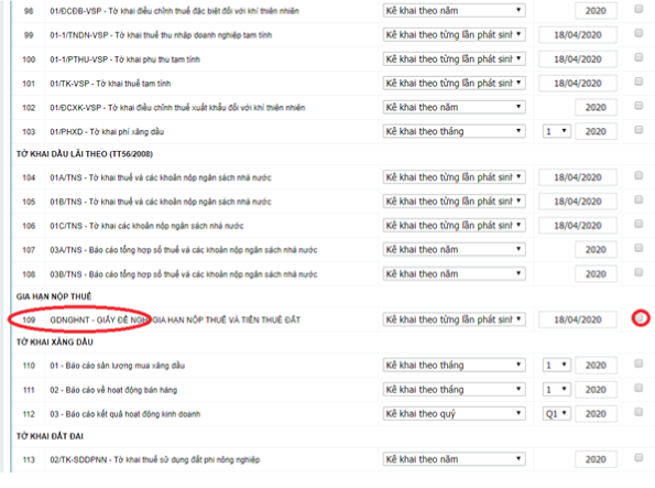 Bước 2: Tra cứu vào trang thuế điện tử nộp tờ khai. Trước khi nộp tờ khai gia hạn tiền thuế. Người nộp thuế vào Đăng ký tờ khai gian hạn tiền thuế theo mẫu sau. ( Nếu bạn chưa đăng ký tờ khai gia hạn thuế thì sẽ không nộp được tờ khai thuế điện tử)