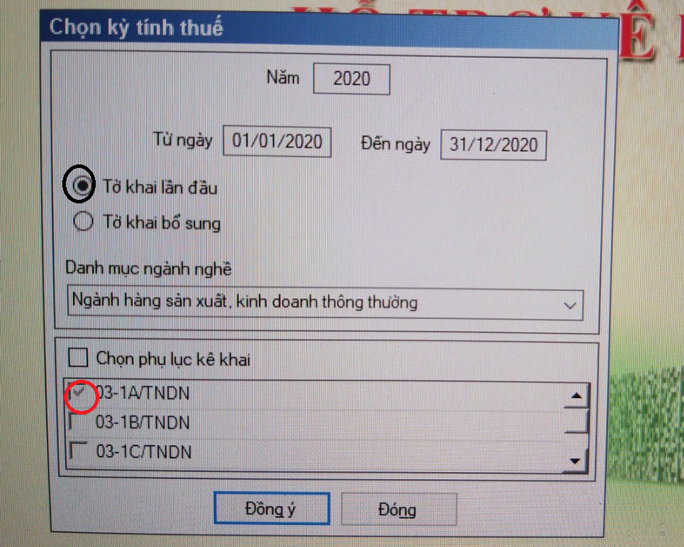 Màn hình hiện ra như trên chọn phụ lục kê khai 03-1A/TNDN và phụ lục miễn giảm thuế thu nhập doanh nghiệp PL114/2020/NĐ-CP. Sau đó điền thông tin vào phụ lục.