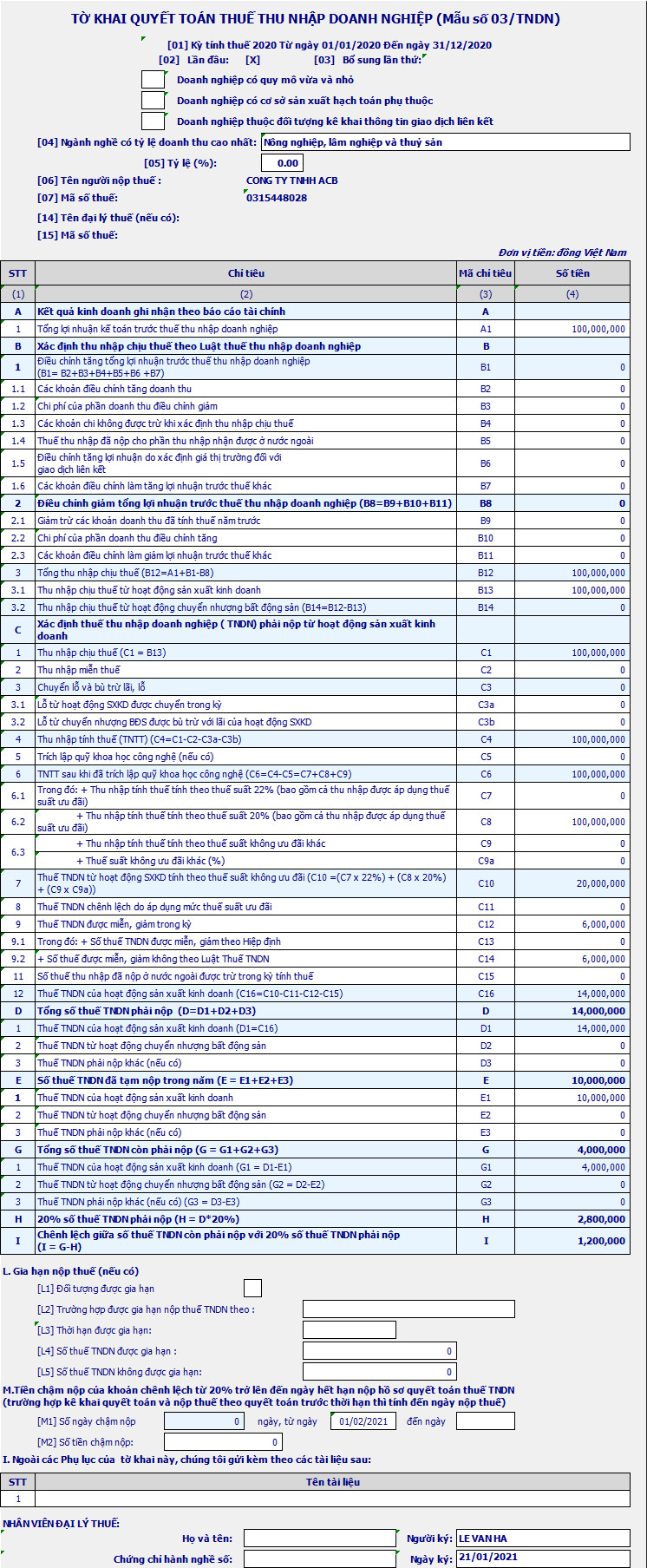 - Ví dụ: Doanh nghiệp A năm 2020 hoạt động có mức doanh thu dưới 200 tỉ. Có phát sinh thuế thu nhập doanh nghiệp như sau: