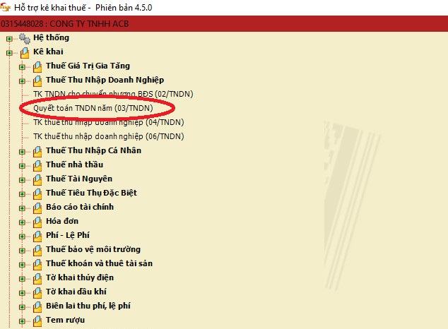 Theo hình trên chọn tờ khai Quyết toán TNDN năm 03/TNDN. Màn hình hiện ra như sau: