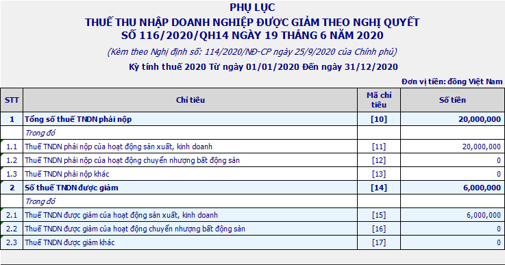 Vào chọn phụ lục 114/2020/ NĐ-CP ---> chọn mã chỉ tiêu 11 --> nhập tiền thuế thu nhập phát sinh năm 2020 chưa giảm là 20.000.000. Phần mềm HTKK tự tính mức giảm 30% vào chỉ tiêu 14 và 15. --> Số tiền này tự động nhảy vào chỉ tiêu C14 trên tờ khai 03/TNDN.