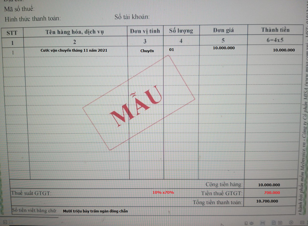 Ví dụ là thuế suất hàng hóa dịch vụ 10% được 30% mục thuế suất ghi (10% x70%)