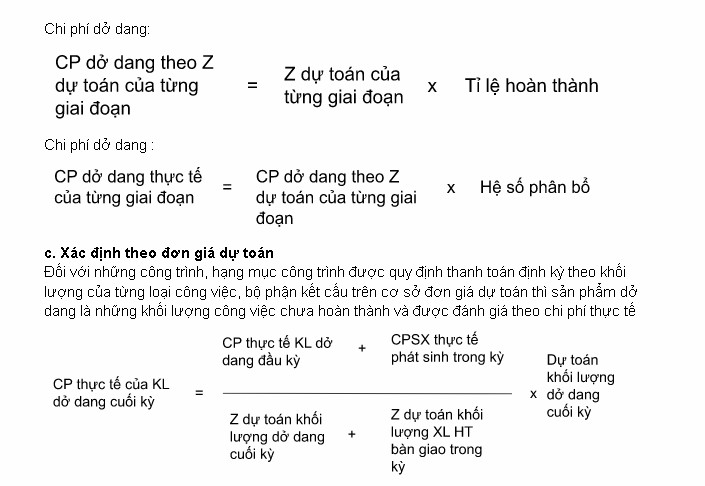 Đối với những công trình, hạng mục công trình được quy định thanh toán định kỳ theo khối lượng của từng loại công việc, bộ phận kết cấu trên cơ sở đơn giá dự toán thì sản phẩm dở dang là những khối lượng công việc chưa hoàn thành và được đánh giá theo chi phí thực tế