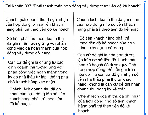 Tài khoản 337 - Thanh toán theo tiến độ kế hoạch hợp đồng xây dựng chỉ áp dụng đối với hợp đồng xây dựng quy định nhà thầu được thanh toán theo tiến độ kế hoạch, không áp dụng đối với trường hợp hợp đồng xây dựng quy định nhà thầu được thanh toán theo giá trị khối lượng thực hiện được khách hàng xác nhận